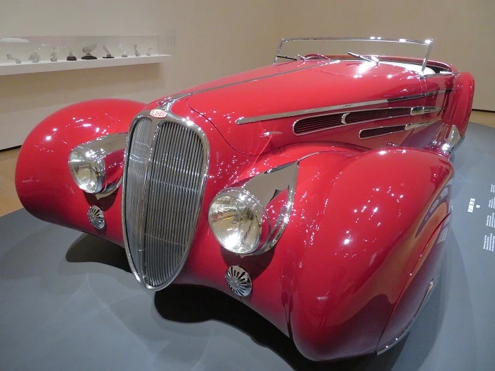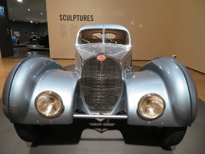 Quizás uno de los más fieles exponentes de la combinación automóvil y escultura pretendida por la exposición, esencialmente por esas fluidas formas curvas, absolutamente envolventes, en las que asoman branquias y estrías y en las que se incrustan tornillos trazando una especie de bisel, a modo de espina, que recorre la carrocería por el centro superior. De este diseño de Jean Bugatti vieron la luz cuatro ejemplares, siendo este el primero de ellos.